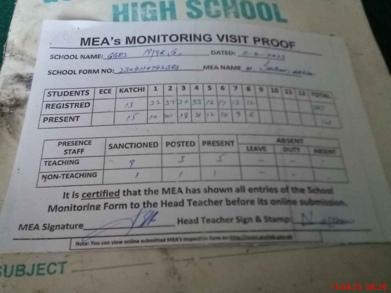| Attendance Register | Head Teacher | MEA with School | Visit Proof |