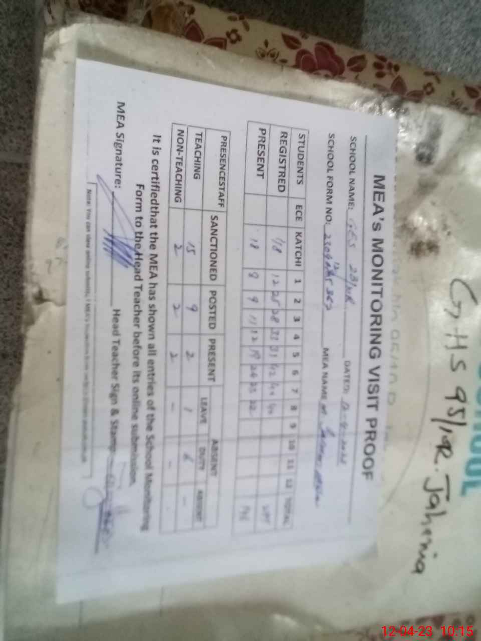 | Attendance Register | Head Teacher | MEA with School | Visit Proof |