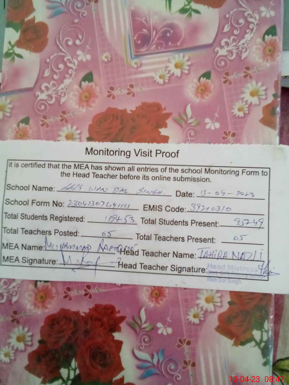 | Attendance Register | Head Teacher | MEA with School | Visit Proof |
