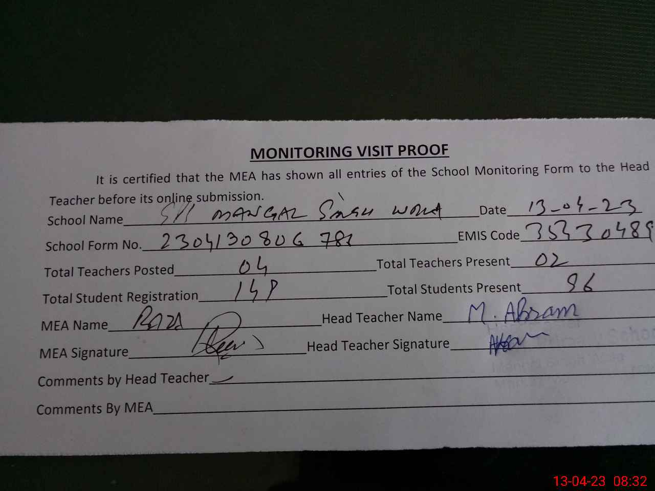 | Attendance Register | Head Teacher | MEA with School | Visit Proof |