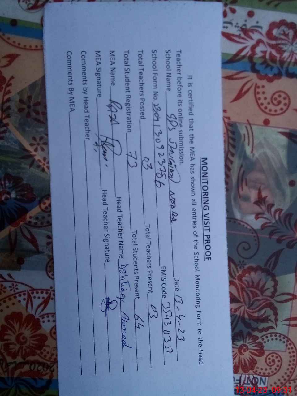 | Attendance Register | Head Teacher | MEA with School | Visit Proof |