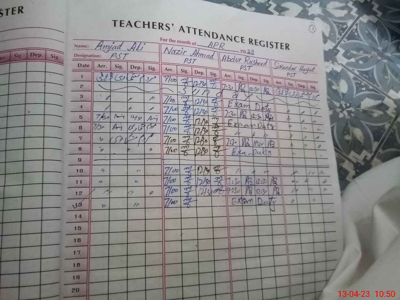 | 36**** | Ab**** Ra**** | PST | Regular | 2 | 0 | 0 | 0 | 0 | 0 | 0 | 0 | 2 | Exam Duty |
