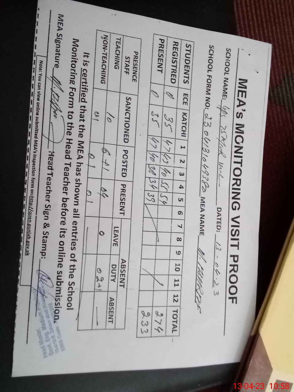 | Attendance Register | Head Teacher | MEA with School | Visit Proof |