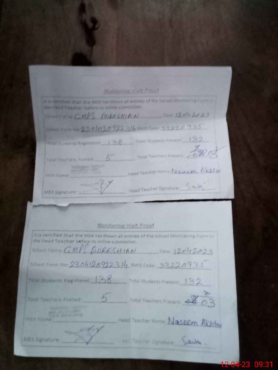 | Attendance Register | Head Teacher | MEA with School | Visit Proof |