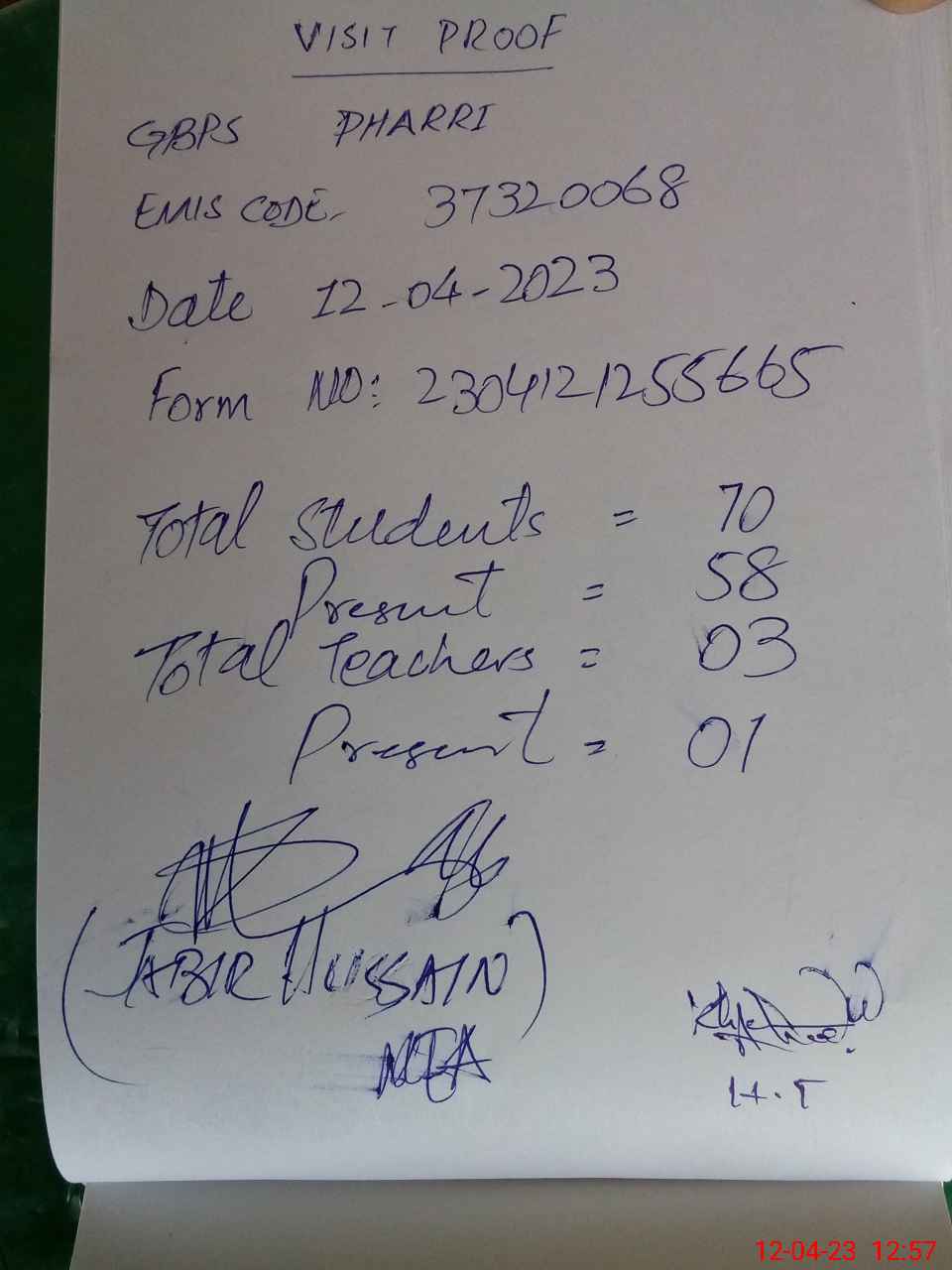| Attendance Register | Head Teacher | MEA with School | Visit Proof |