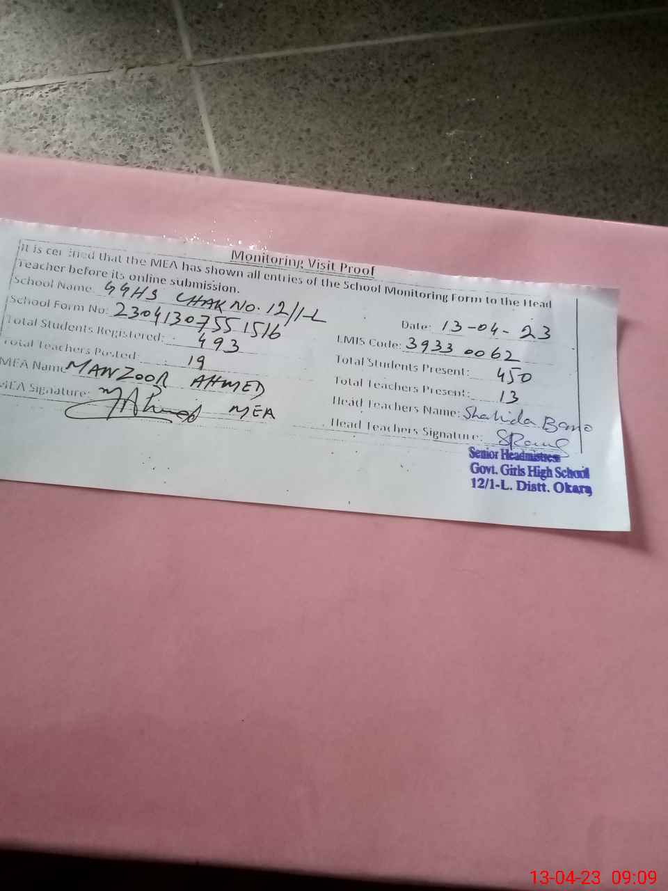 | EMIS Code: 39330062 | Name of School: GGHS CHAK NO.12/1-L | |||