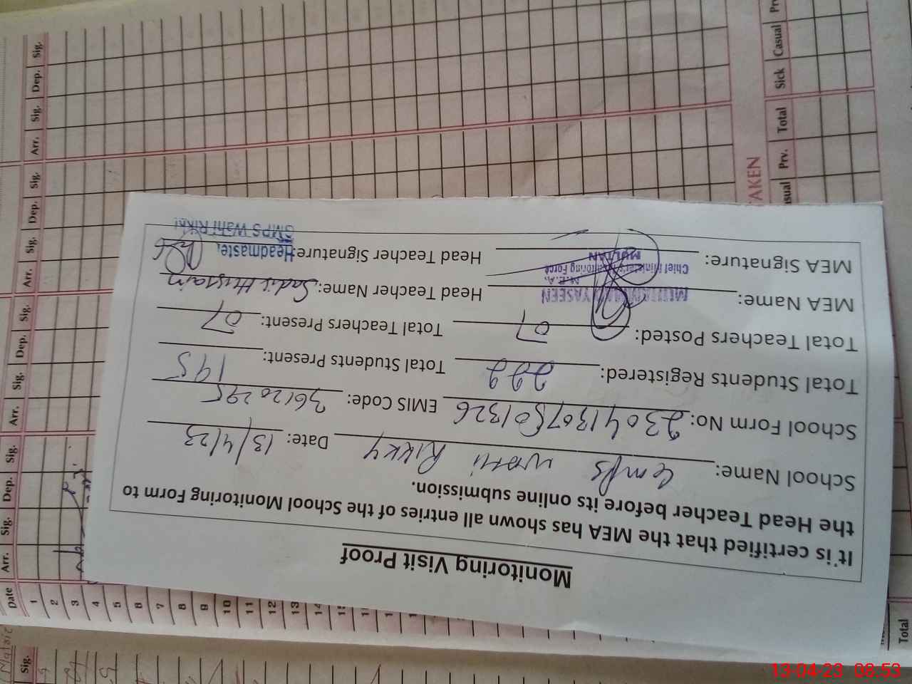 | Attendance Register | Head Teacher | MEA with School | Visit Proof |