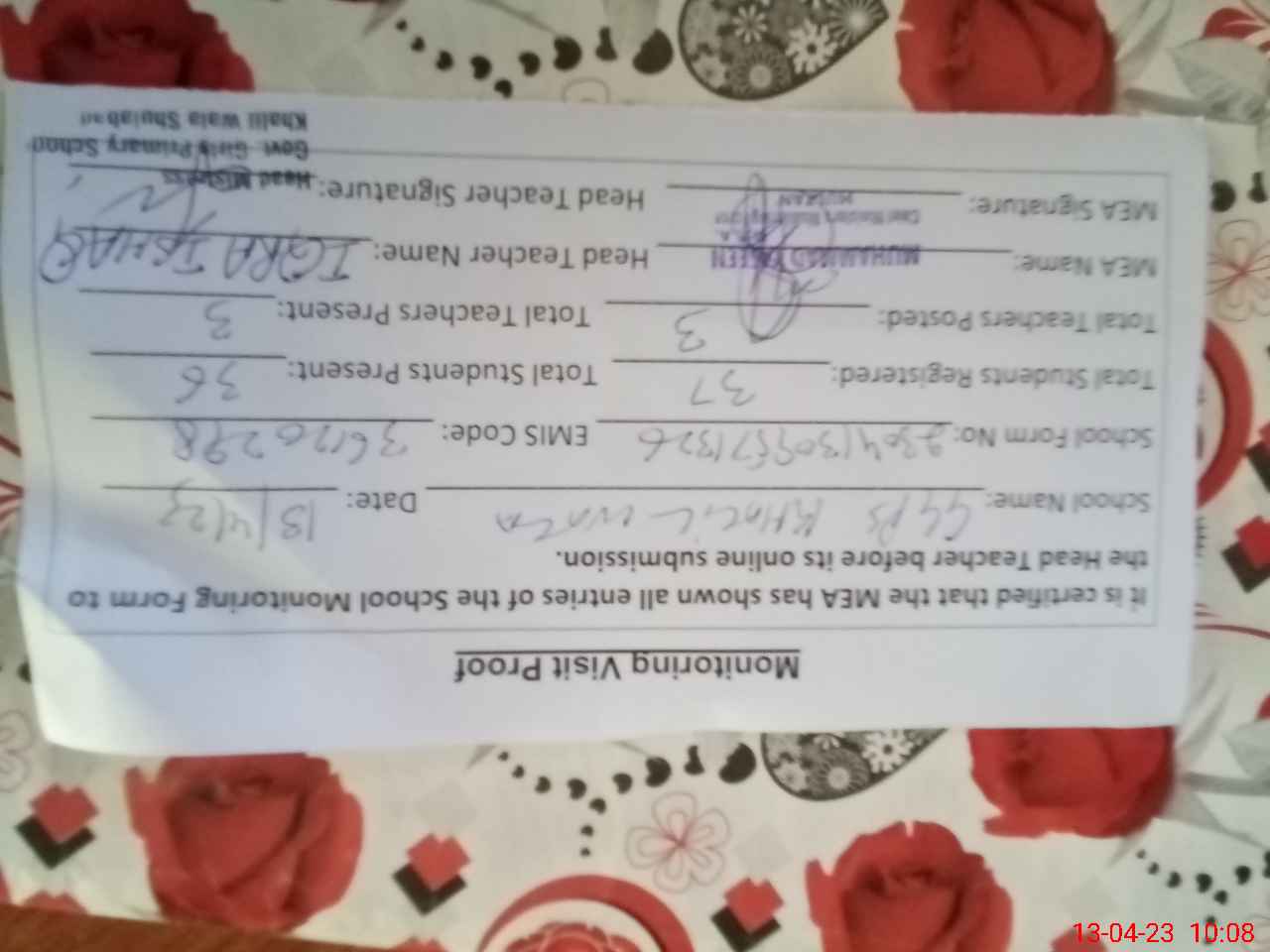 | Attendance Register | Head Teacher | MEA with School | Visit Proof |