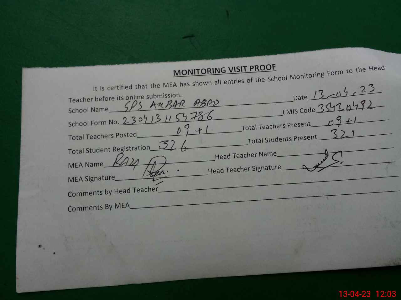 | Attendance Register | Head Teacher | MEA with School | Visit Proof |