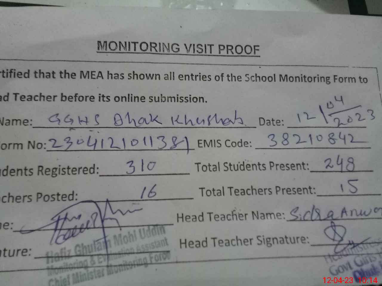 | EMIS Code: 38210842 | Name of School: GGHS DHAK KHUSHAB | |||