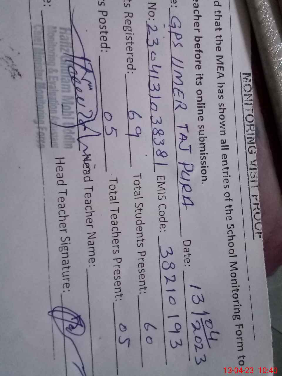 | Attendance Register | Head Teacher | MEA with School | Visit Proof |