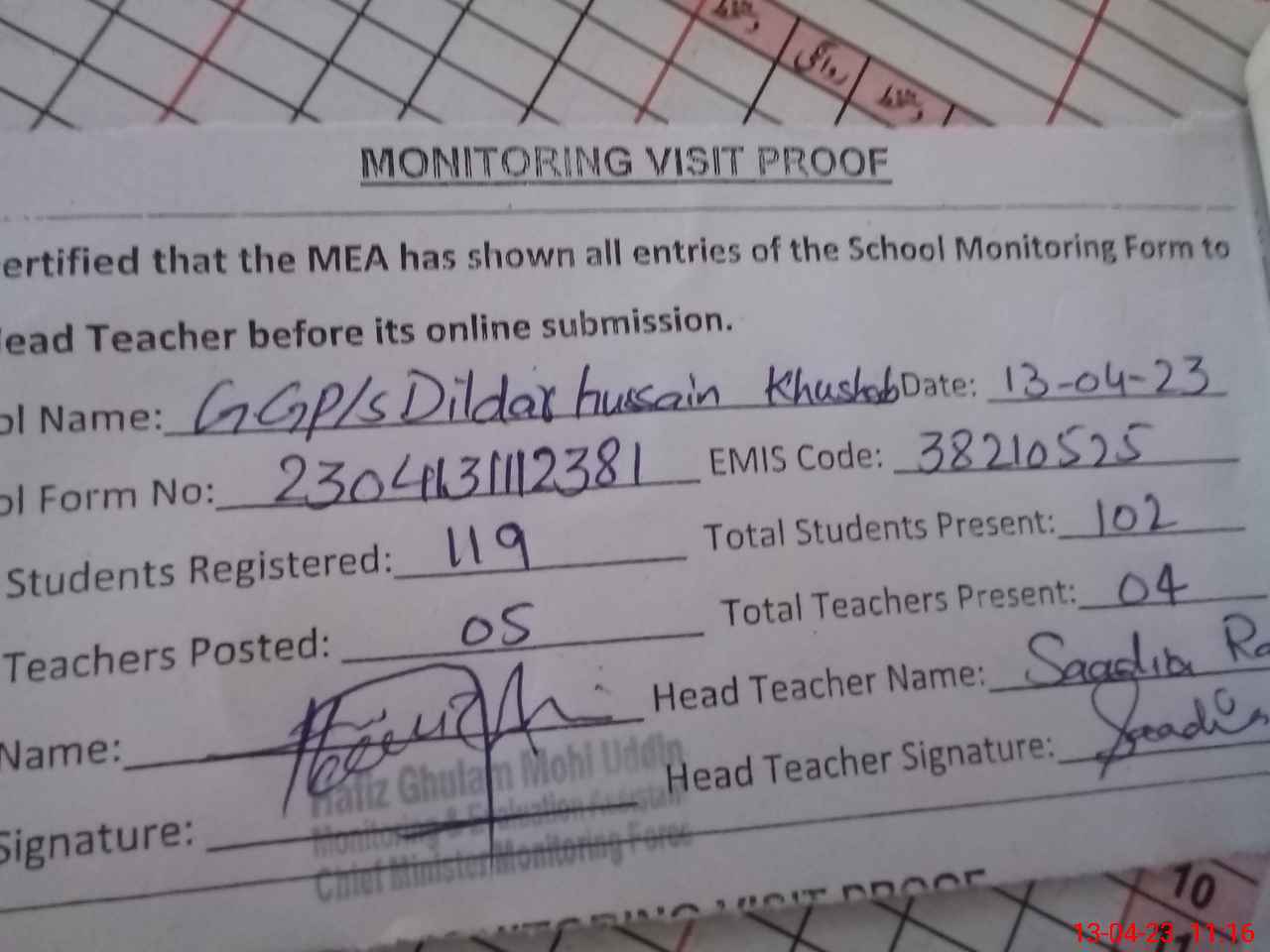 | Attendance Register | Head Teacher | MEA with School | Visit Proof |