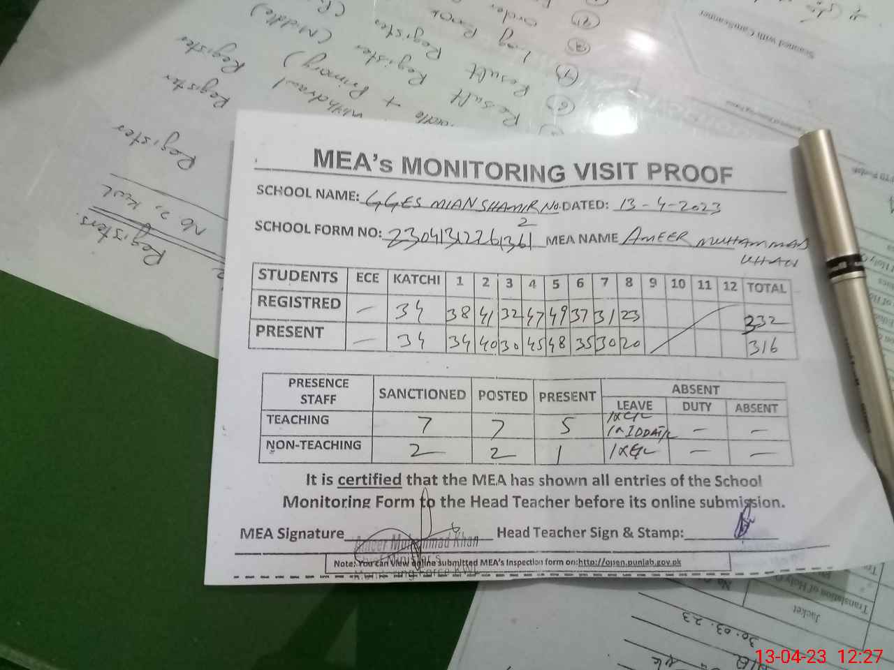 | Attendance Register | Head Teacher | MEA with School | Visit Proof |