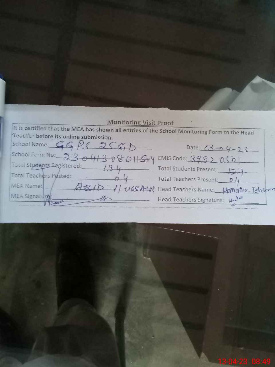 | Attendance Register | Head Teacher | MEA with School | Visit Proof |