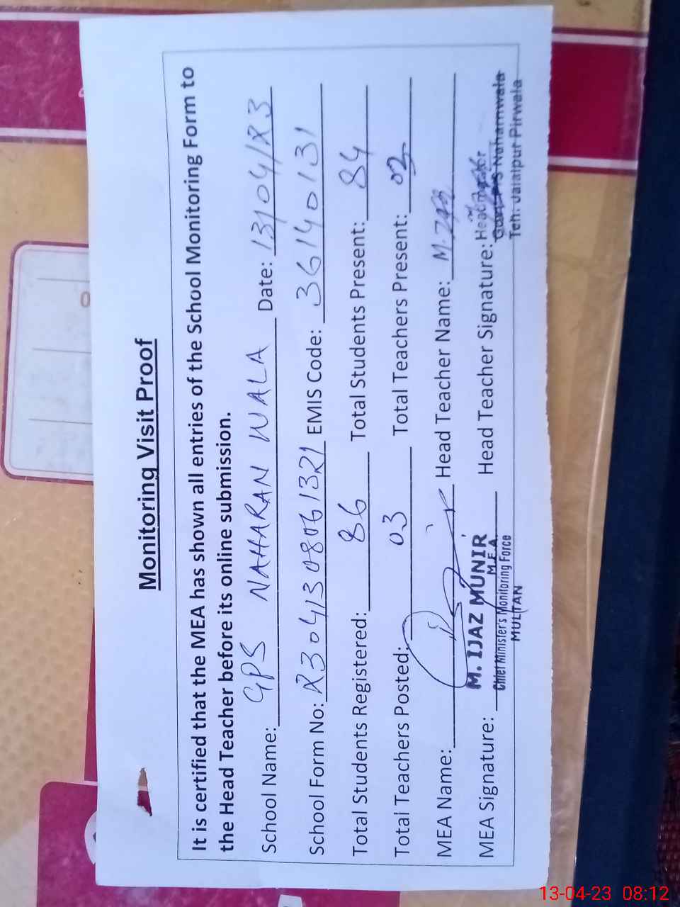 | Attendance Register | Head Teacher | MEA with School | Visit Proof |