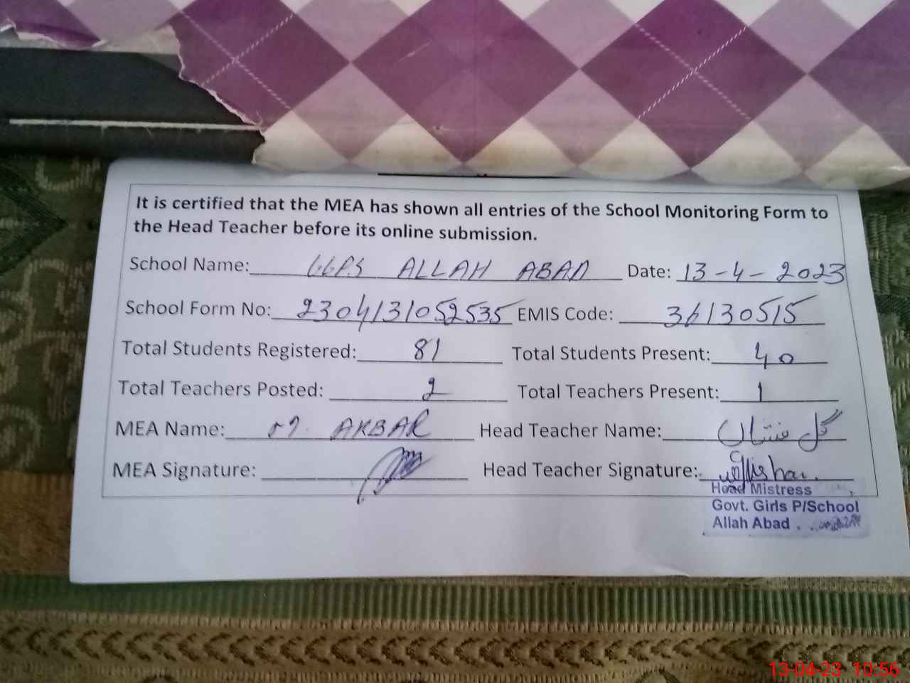 | EMIS Code: 36130515 | Name of School: GGPS ALLAH ABAD MULTAN | |||
