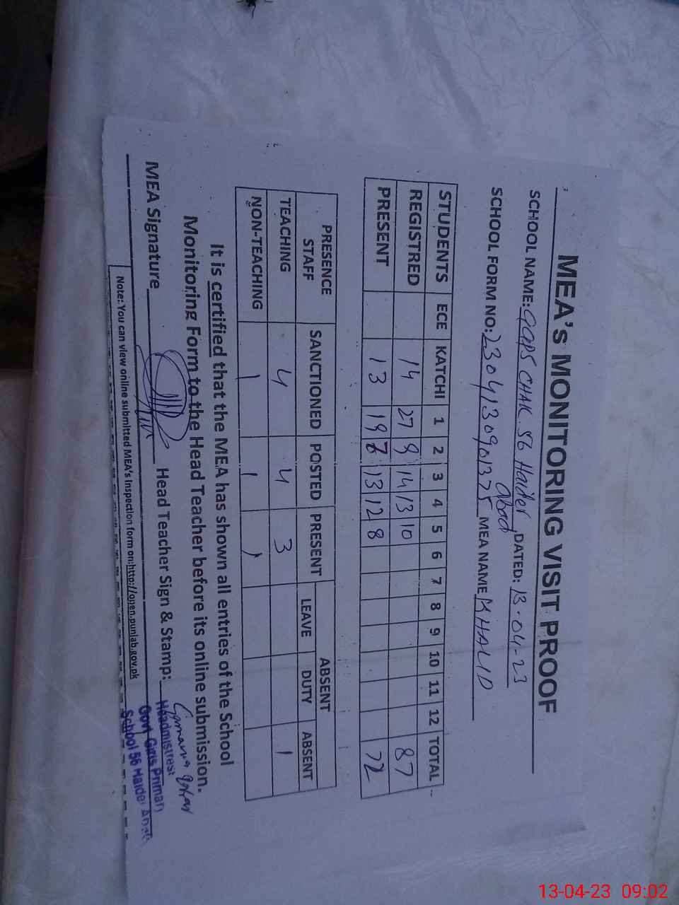 | Attendance Register | Head Teacher | MEA with School | Visit Proof |