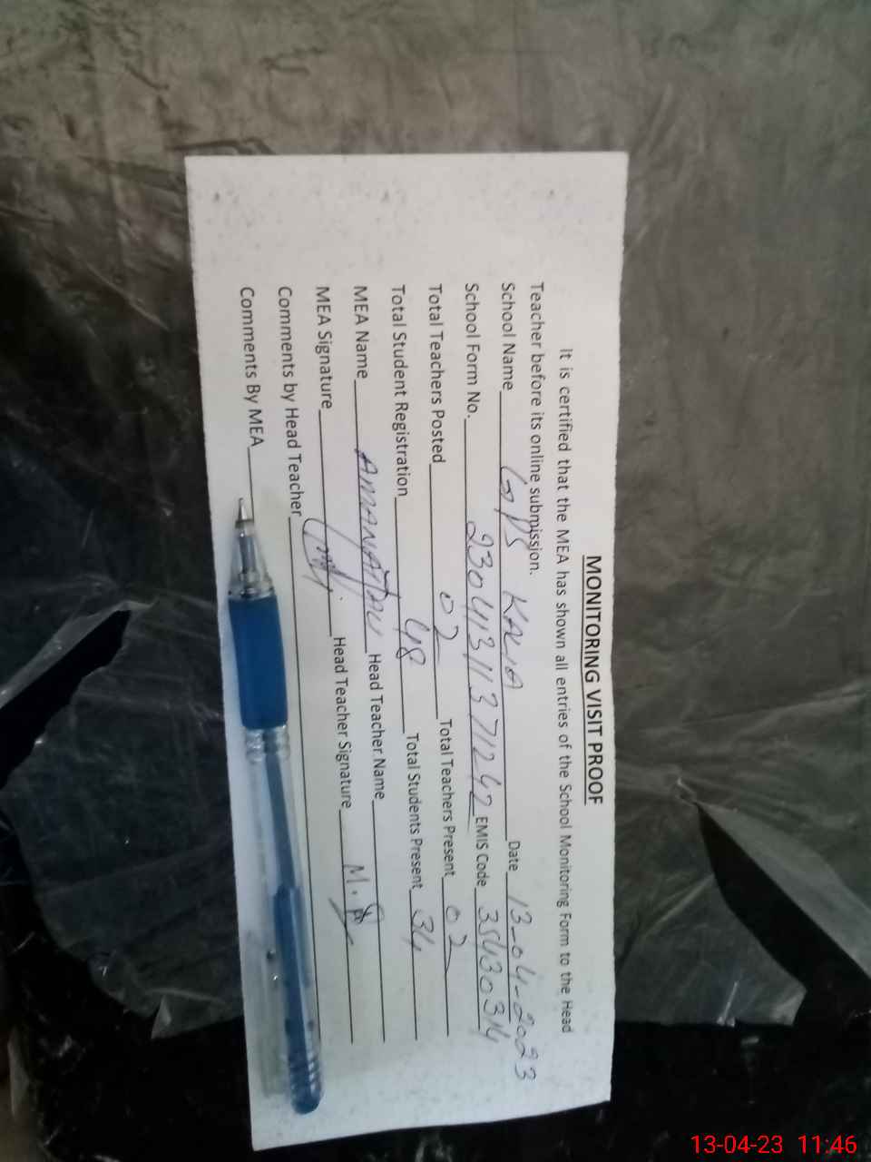 | Attendance Register | Head Teacher | MEA with School | Visit Proof |