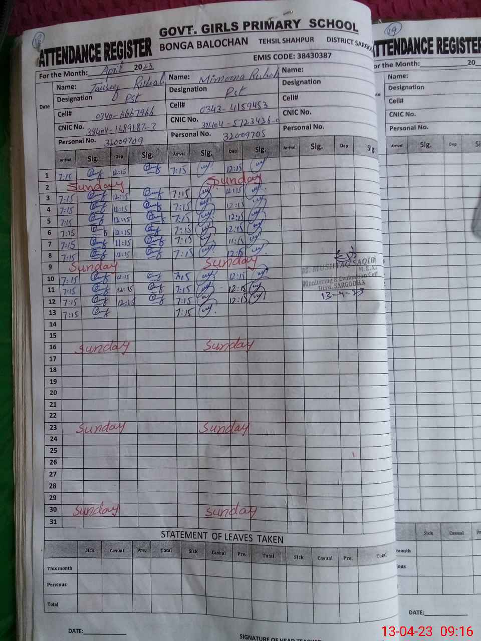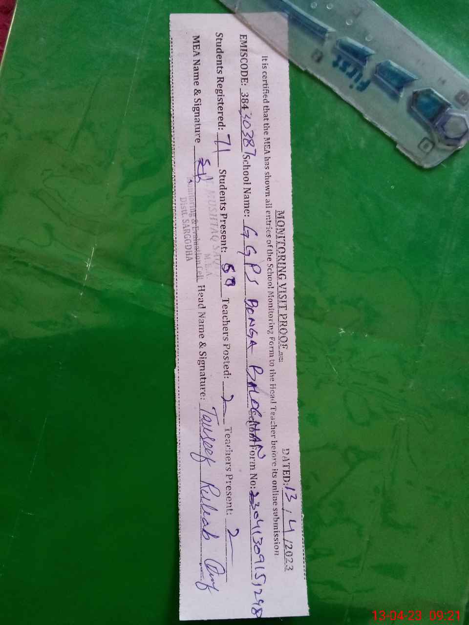 | Attendance Register | Head Teacher | MEA with School | Visit Proof |