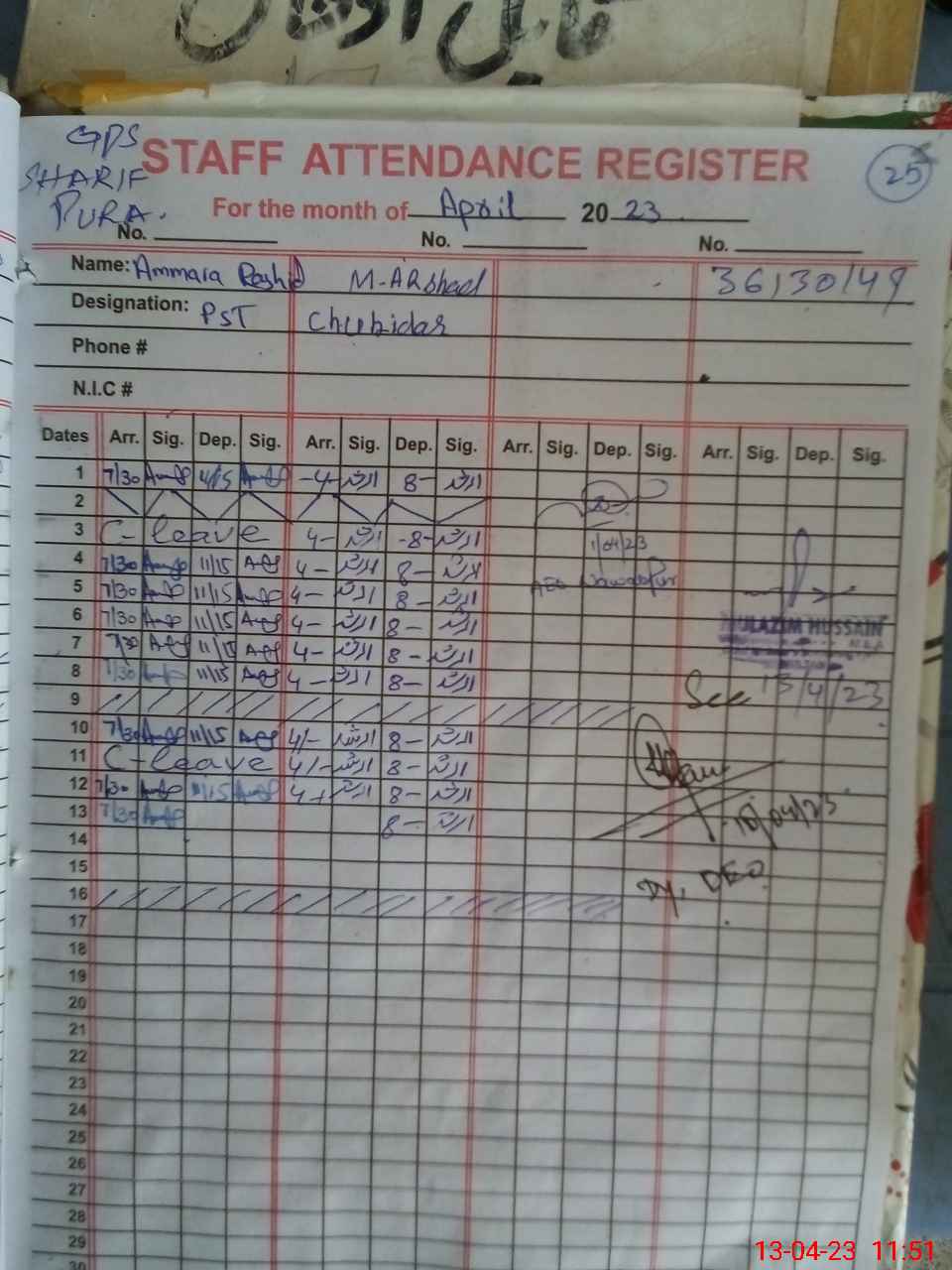 | CNIC | Full Name | Designation | R/C | Absence During Last Calender Month |