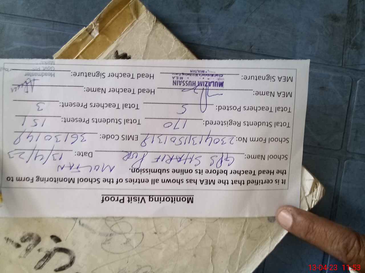 | Attendance Register | Head Teacher | MEA with School | Visit Proof |