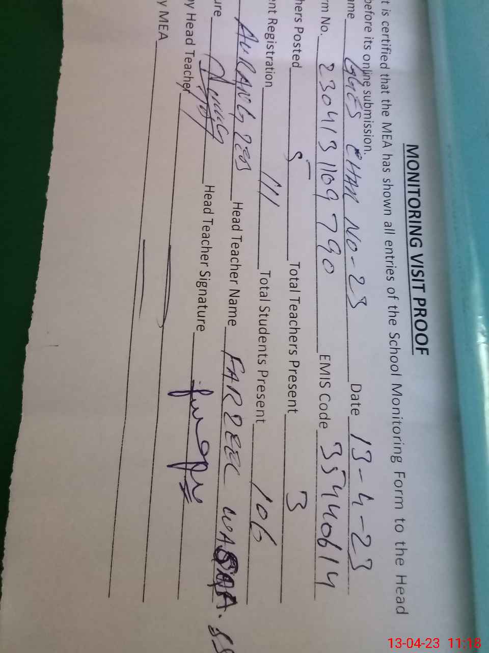 | Attendance Register | Head Teacher | MEA with School | Visit Proof |