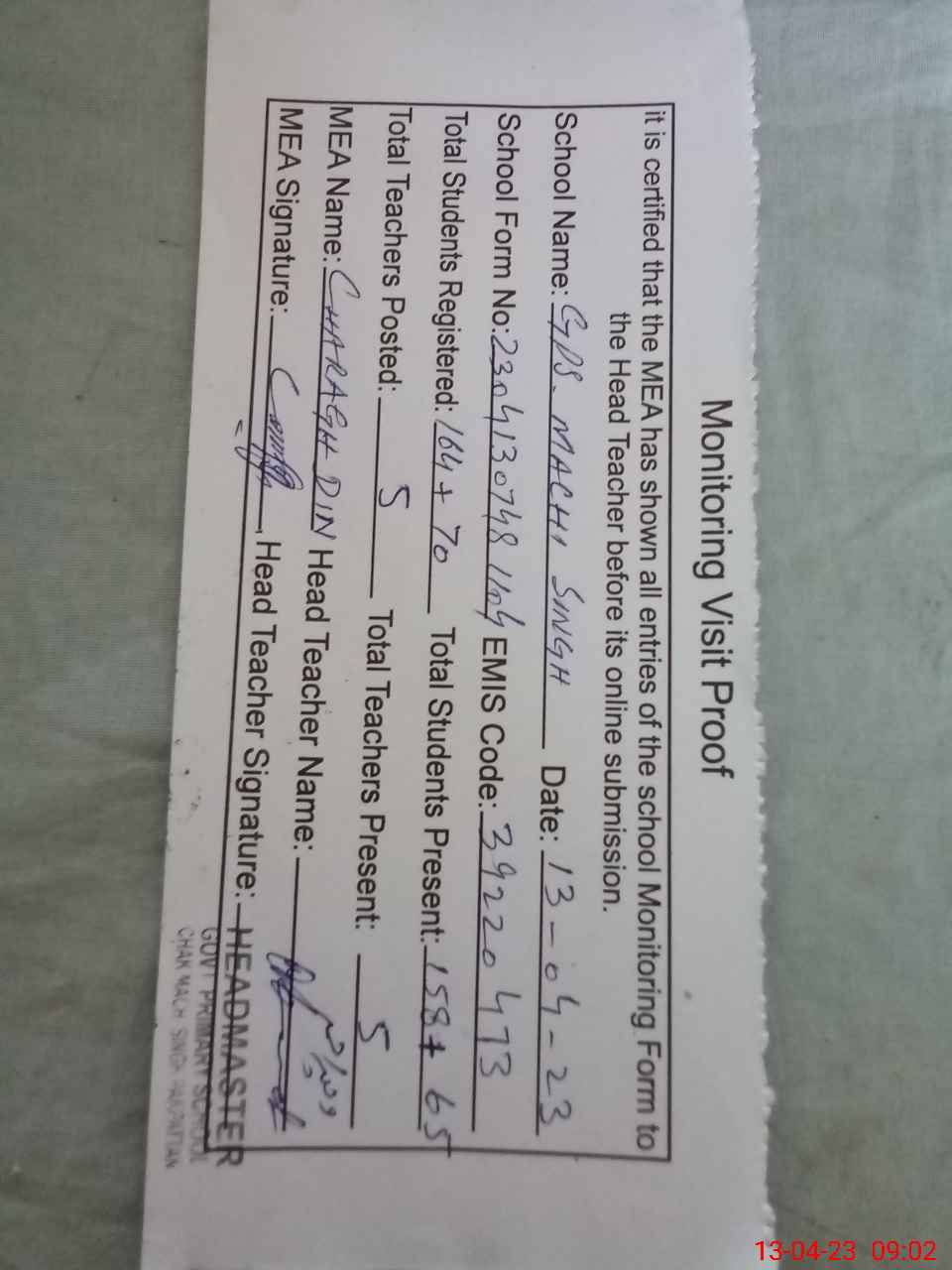 | Attendance Register | Head Teacher | MEA with School | Visit Proof |