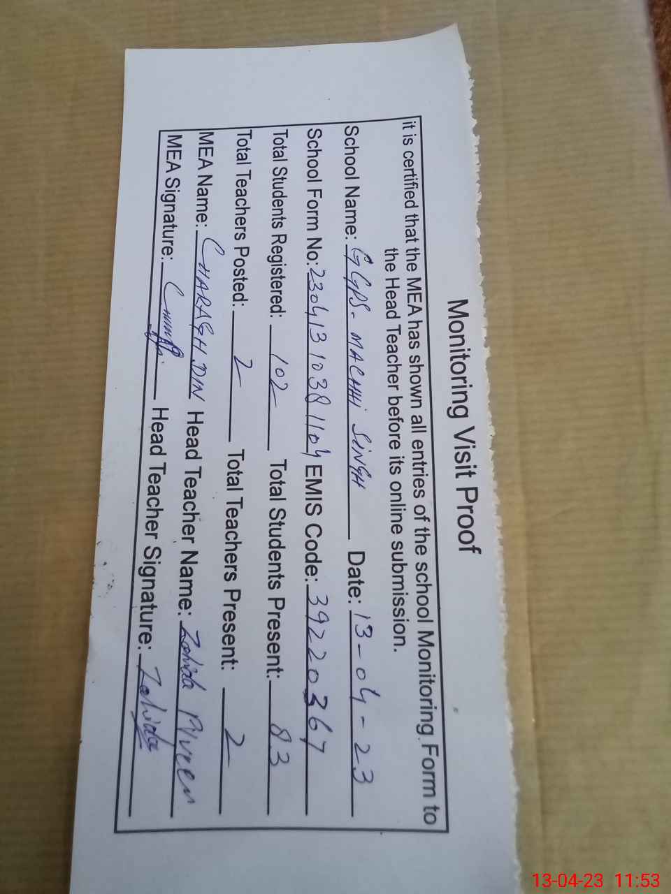 | Attendance Register | Head Teacher | MEA with School | Visit Proof |