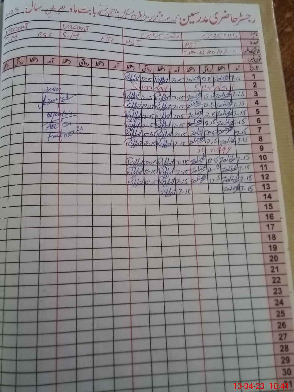 | CNIC | Full Name | Designation | R/C | Absence During Last Calender Month |