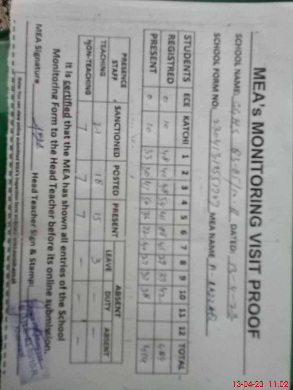 | Attendance Register | Head Teacher | MEA with School | Visit Proof |