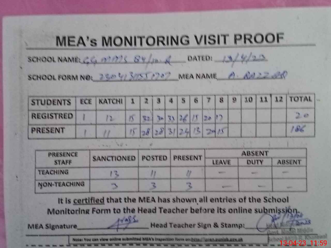 | Attendance Register | Head Teacher | MEA with School | Visit Proof |