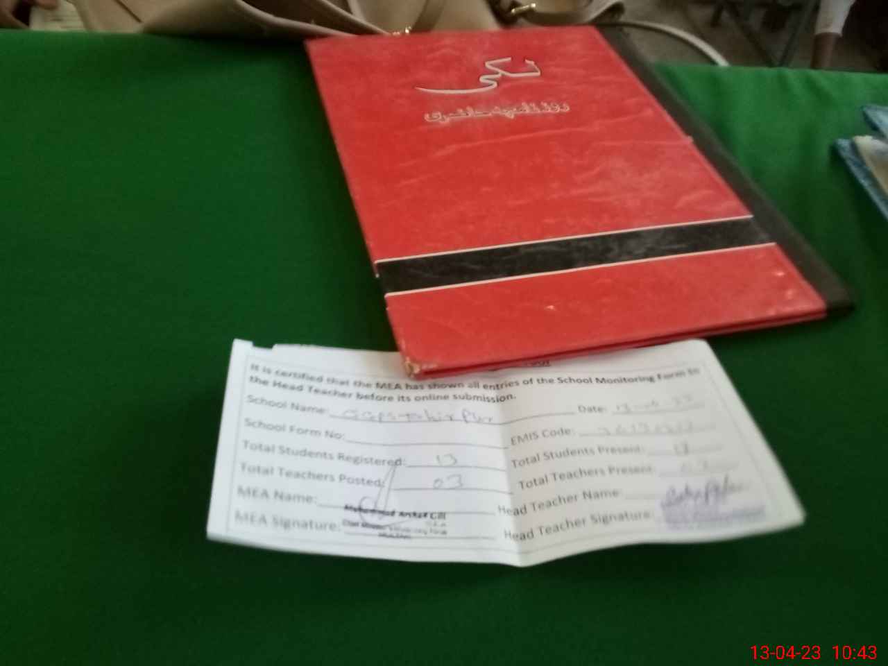 | Attendance Register | Head Teacher | MEA with School | Visit Proof |