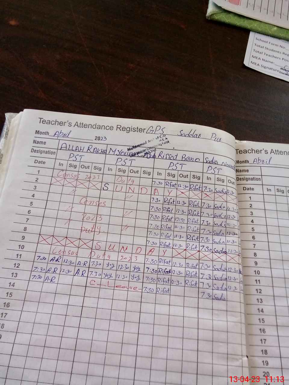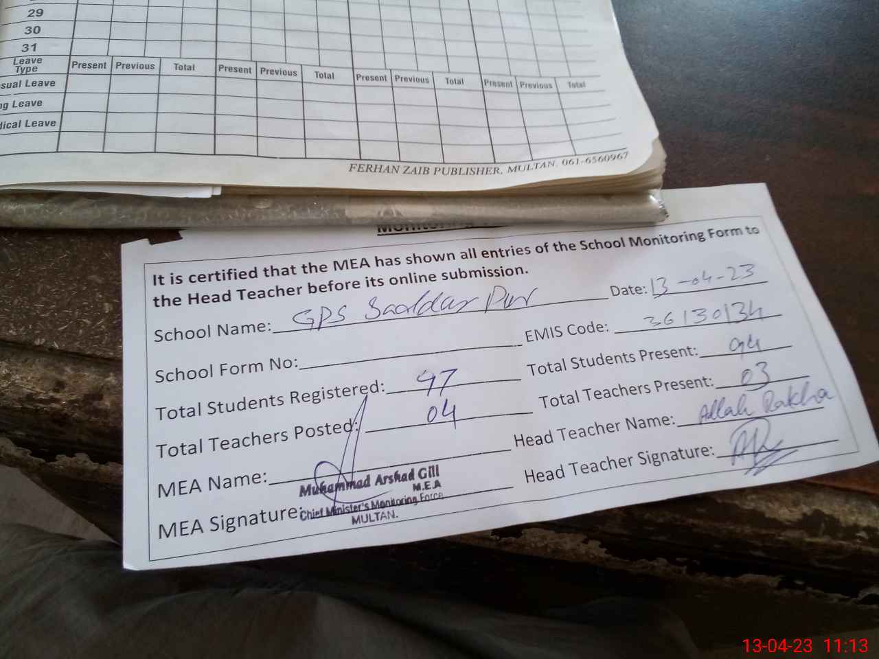 | Attendance Register | Head Teacher | MEA with School | Visit Proof |
