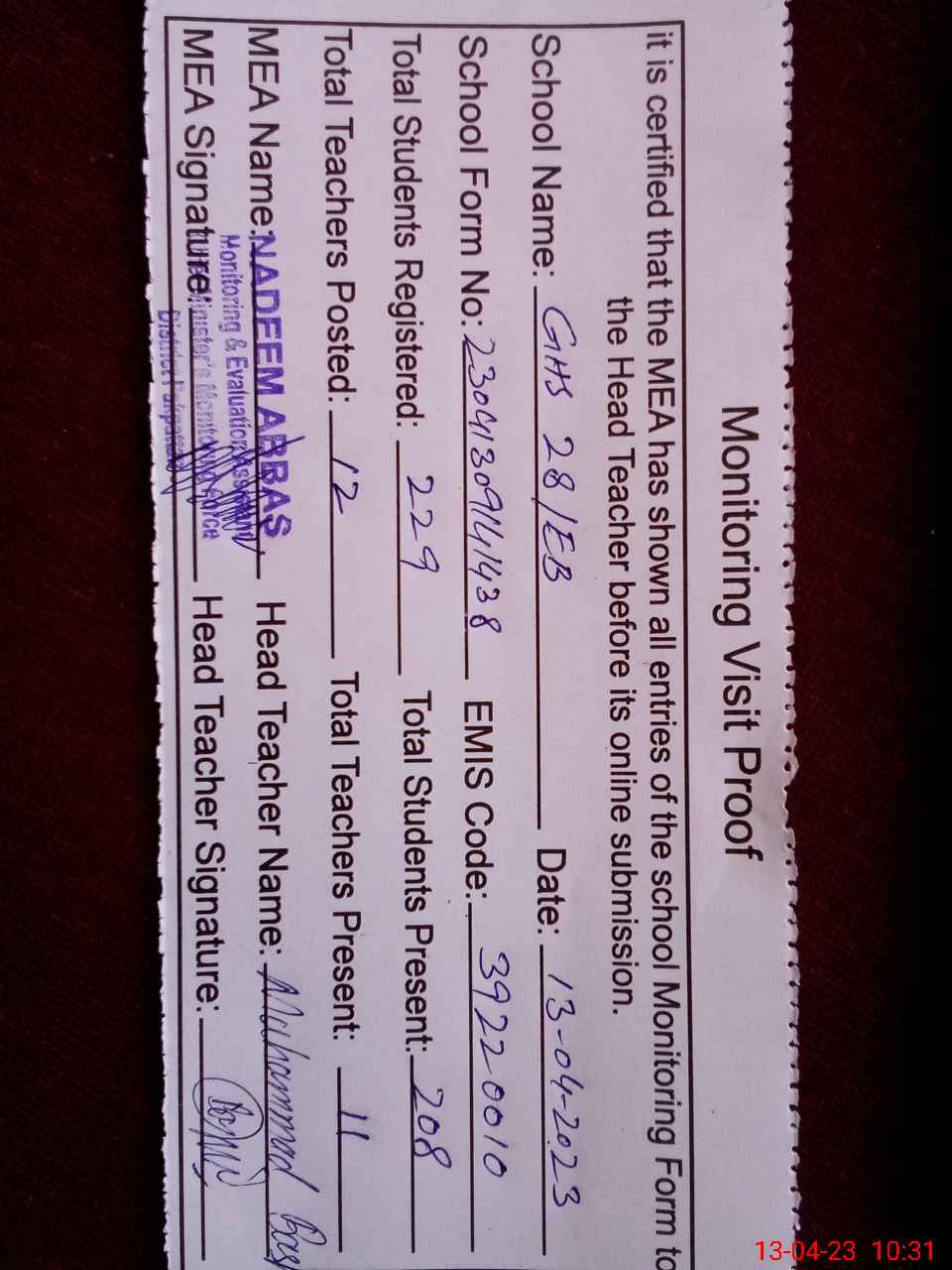 | Attendance Register | Head Teacher | MEA with School | Visit Proof |