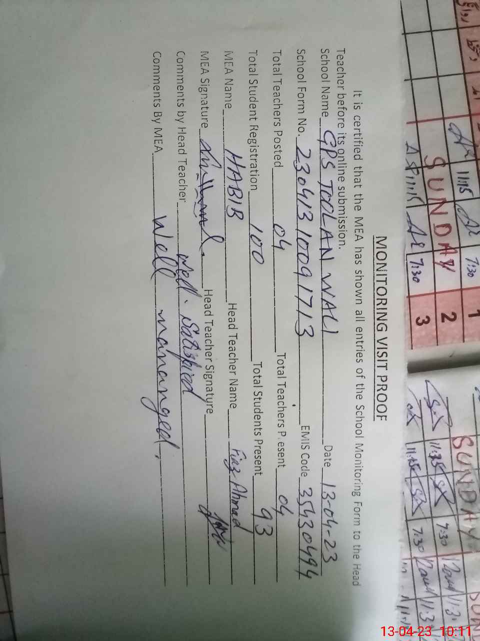 | EMIS Code: 35430494 | Name of School: GPS TOOLAN WALI | |||
