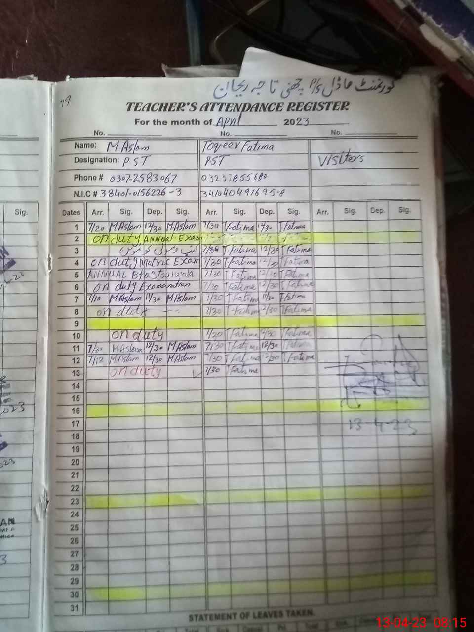 | CNIC | Full Name | Designation | R/C | Absence During Last Calender Month |
