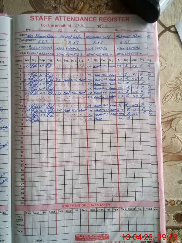 | CNIC | Full Name | Designation | R/C | Absence During Last Calender Month |