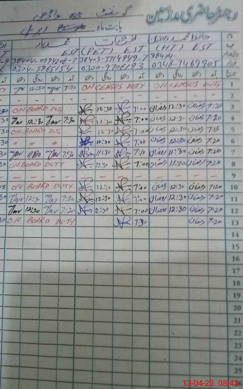 | CNIC | Full Name | Designation | R/C | Absence During Last Calender Month |