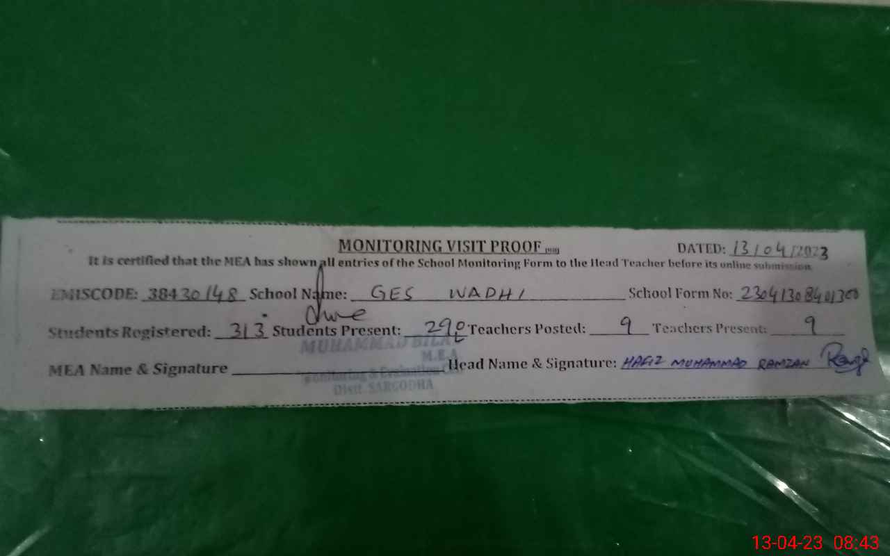 | District: SARGODHA | Tehsil: SHAHPUR | Markaz: WADHI - MALE | Level: Middle | |