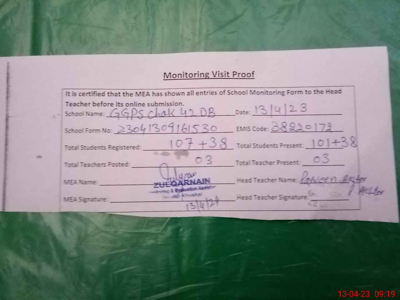 | Attendance Register | Head Teacher | MEA with School | Visit Proof |