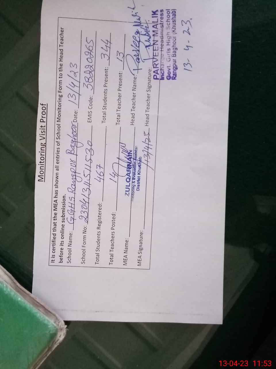 | Attendance Register | Head Teacher | MEA with School | Visit Proof |