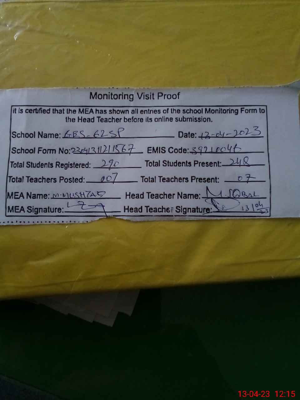| Attendance Register | Head Teacher | MEA with School | Visit Proof |