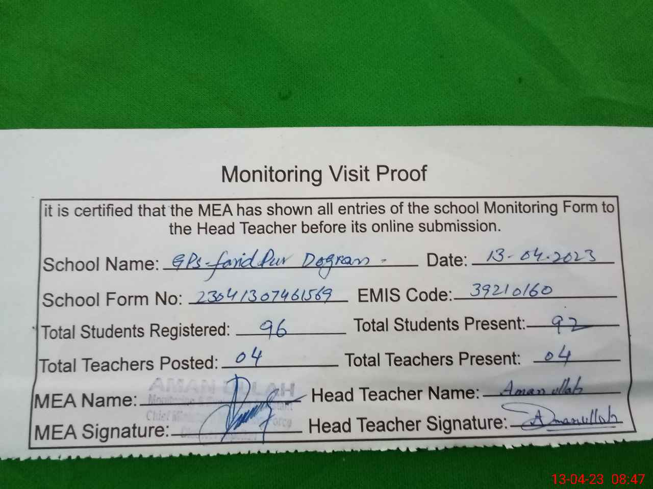 | EMIS Code: 39210160 | Name of School: GPS FARID PUR DOGRAN | |||