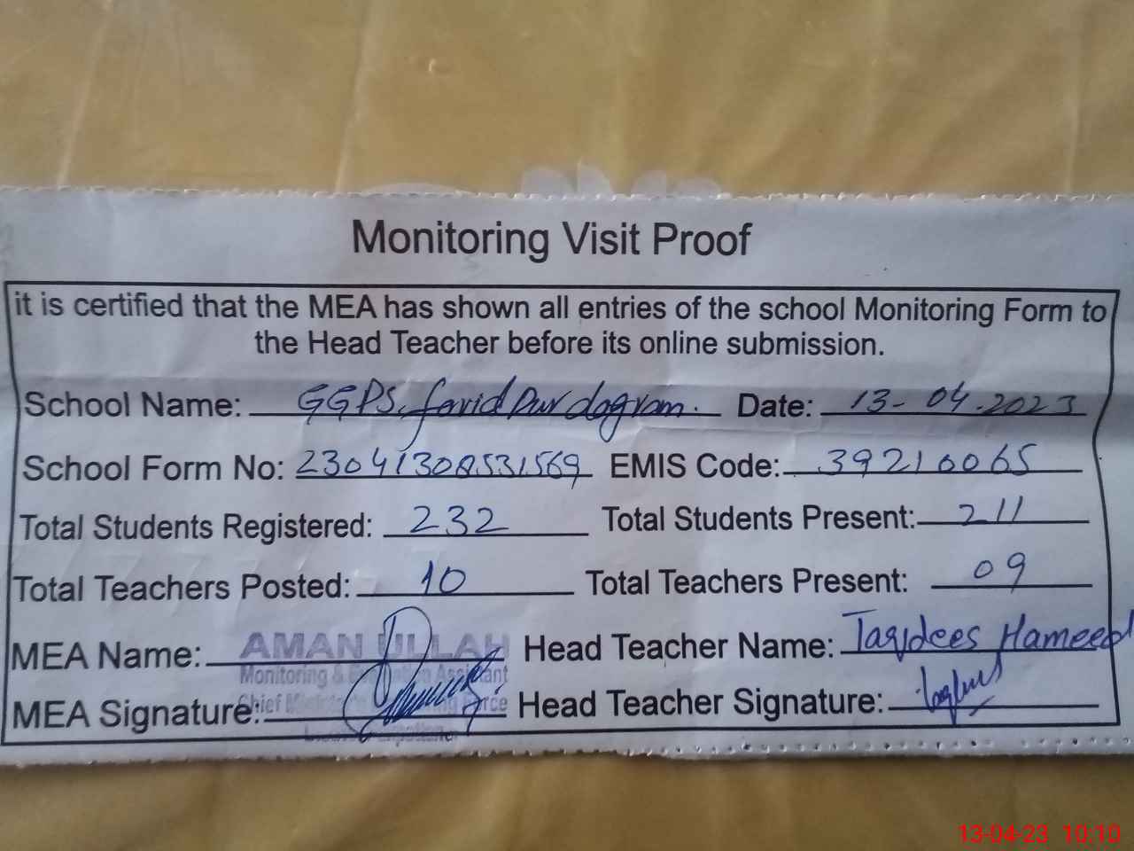 | Attendance Register | Head Teacher | MEA with School | Visit Proof |