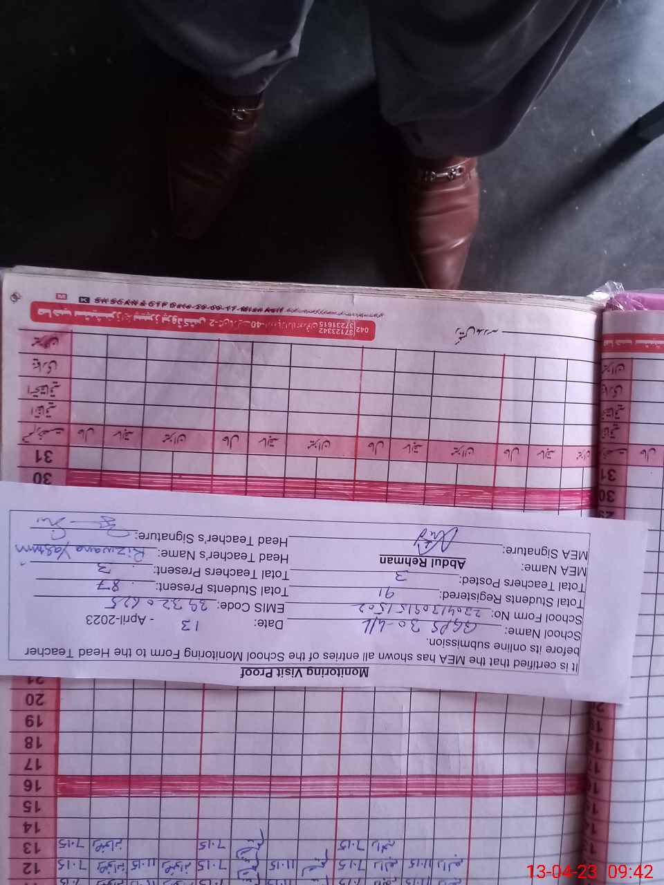 | Attendance Register | Head Teacher | MEA with School | Visit Proof |