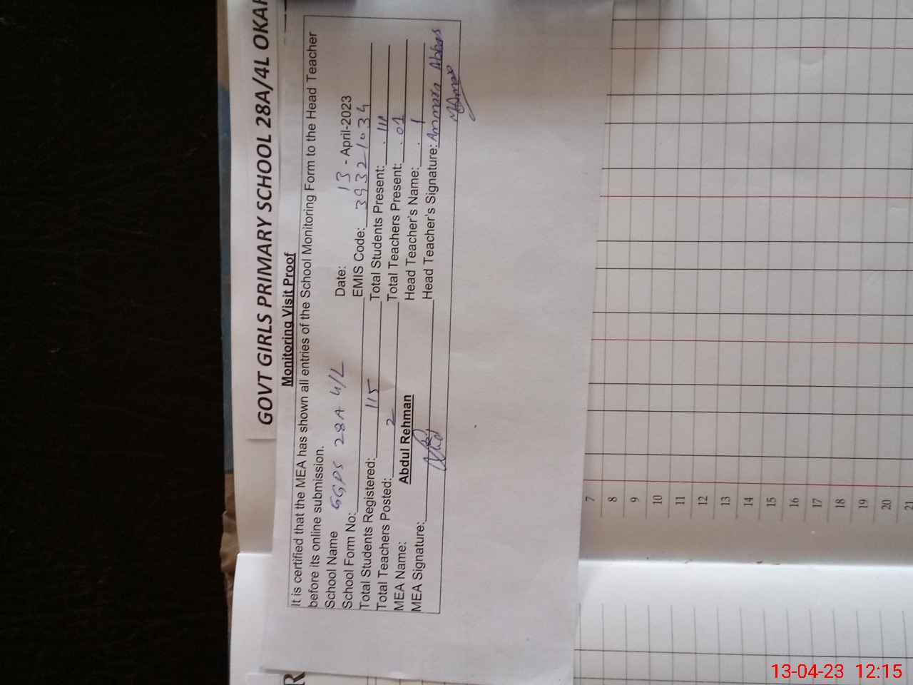 | Attendance Register | Head Teacher | MEA with School | Visit Proof |