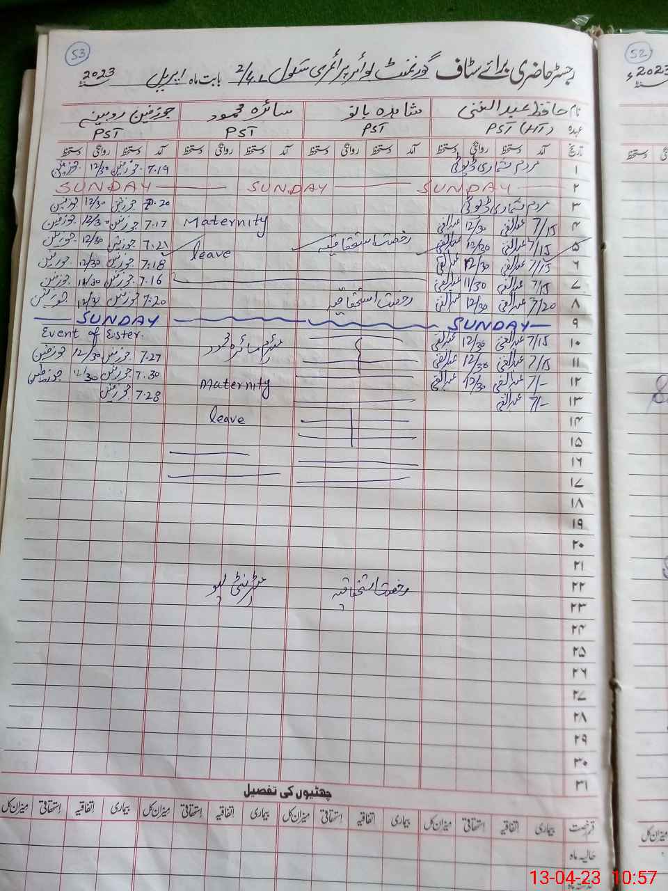 | 35**** | Sa**** Ma**** | PST | Regular | 31 | 0 | 0 | 31 | 0 | 0 | 0 | 0 | 0 | Maternity |
