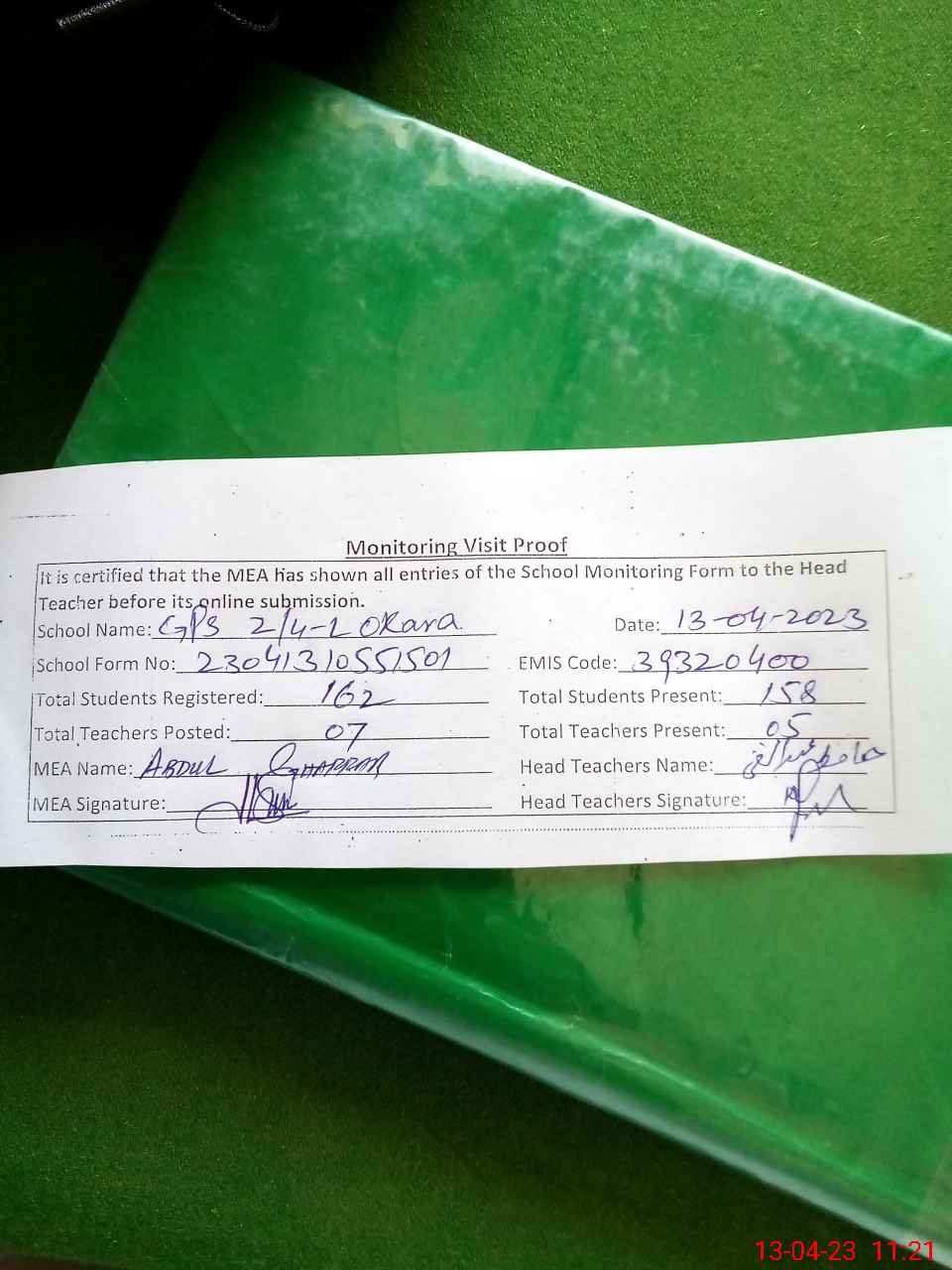 | Attendance Register | Head Teacher | MEA with School | Visit Proof |