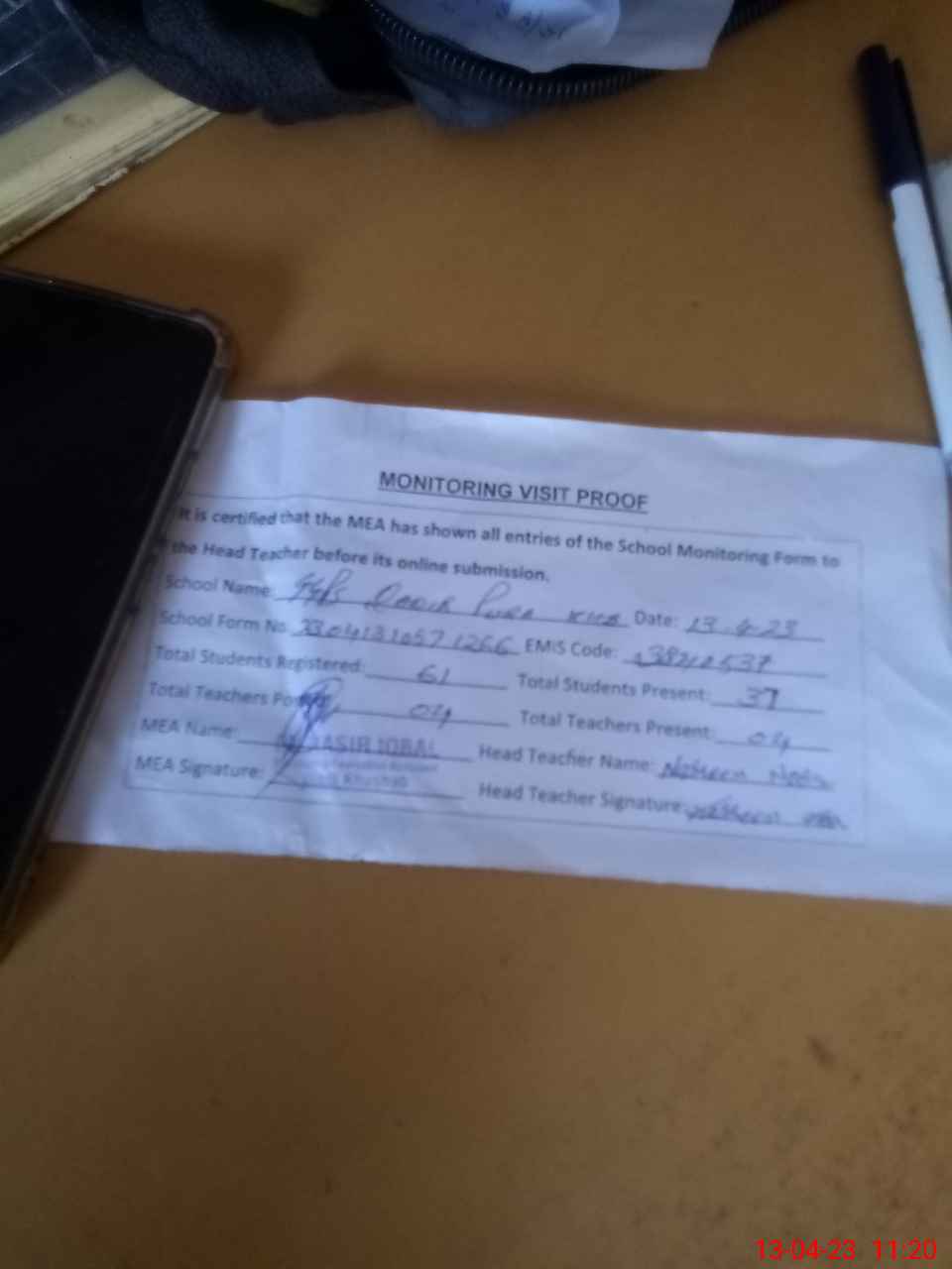 | Attendance Register | Head Teacher | MEA with School | Visit Proof |