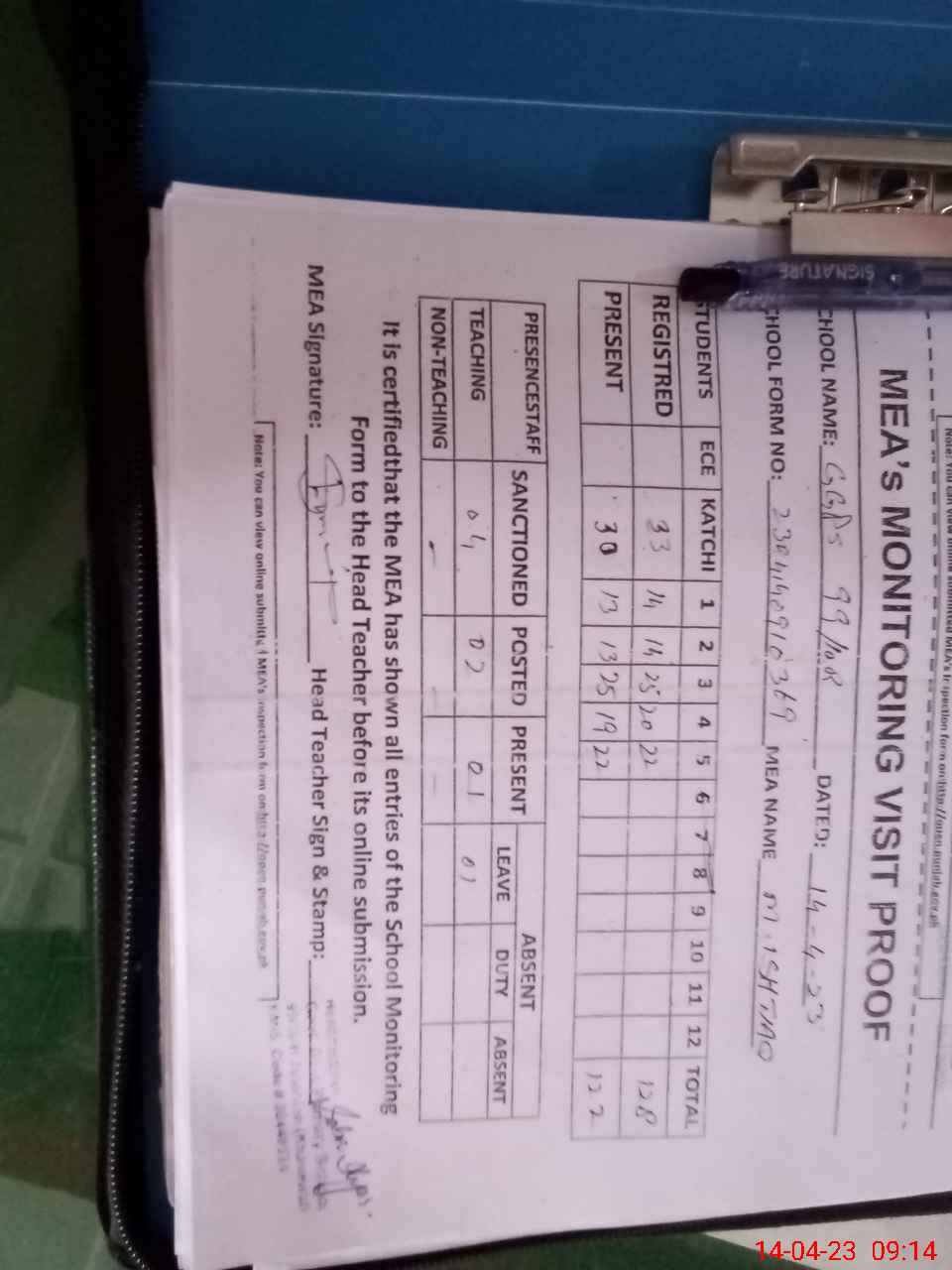 | Attendance Register | Head Teacher | MEA with School | Visit Proof |